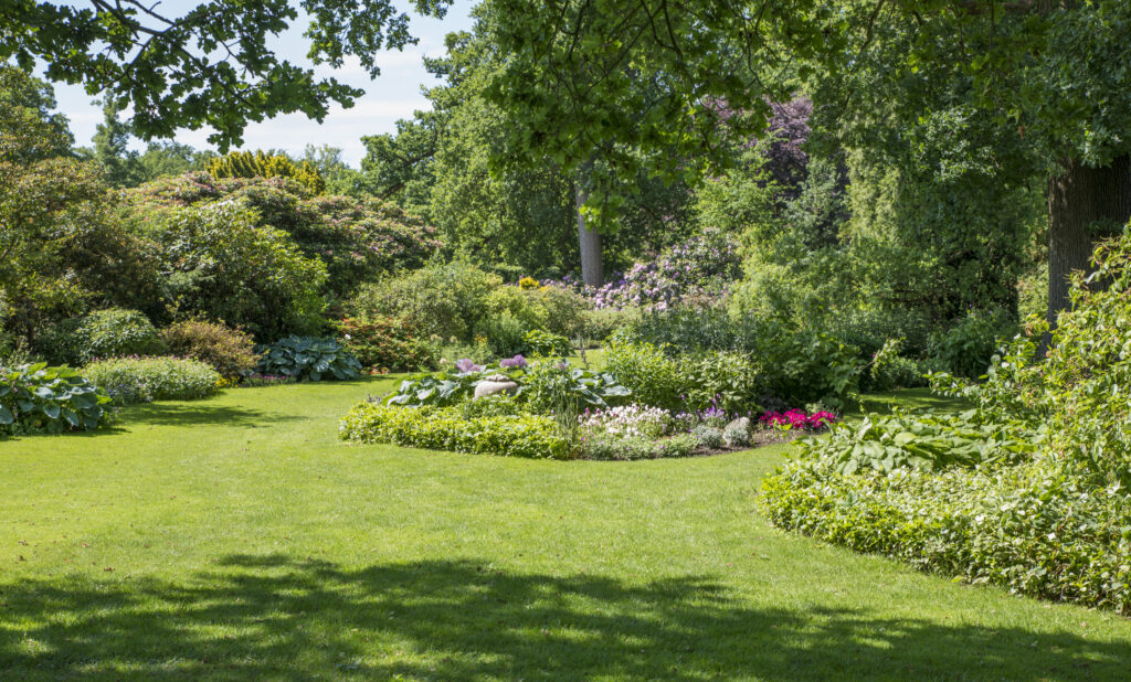 A vibrant english garden displaying colorful flower beds, lush green grass, and various trees under a sunny sky, creating a serene and picturesque outdoor space ideal for relaxation and nature enjoyment